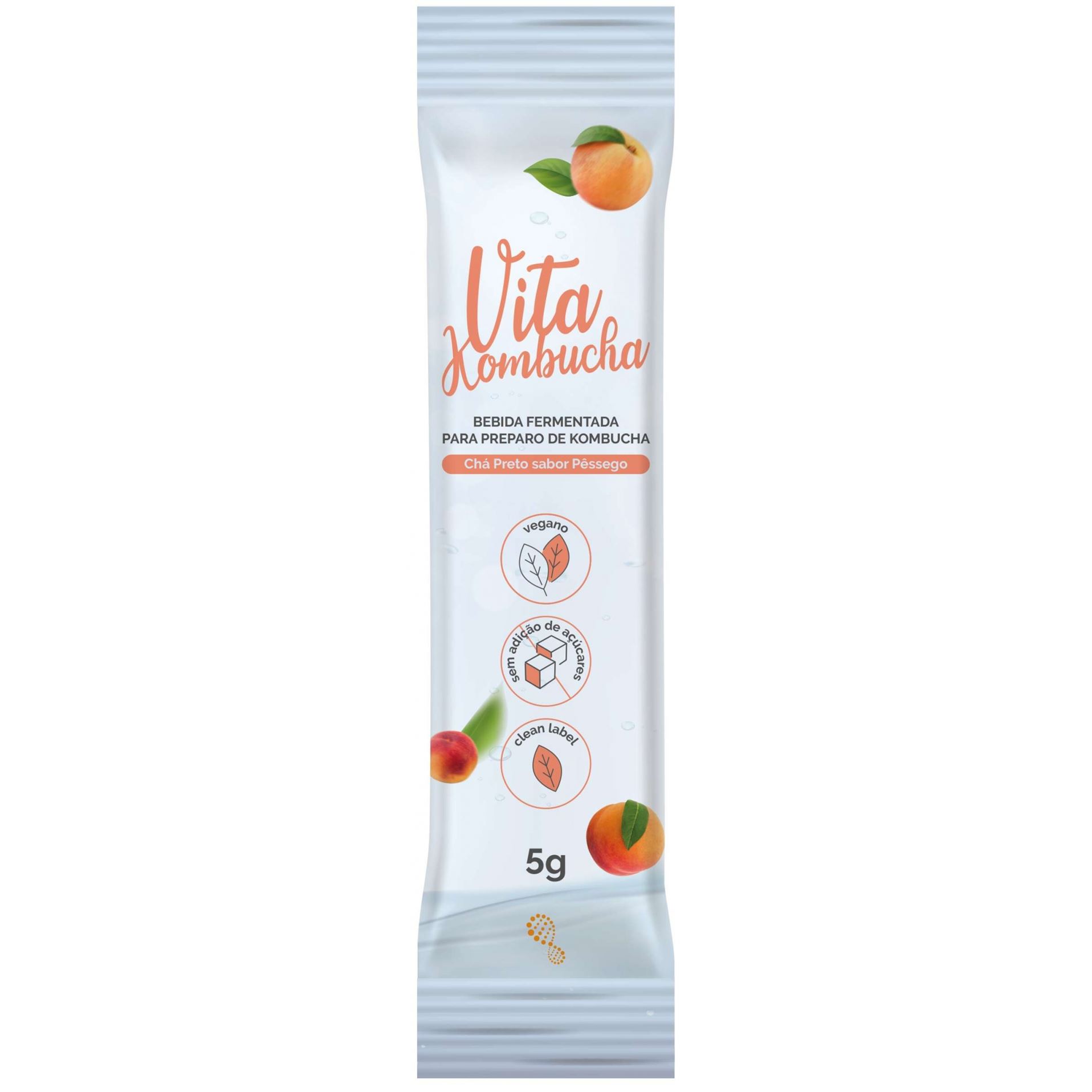 - Dissolver 1 sachê de Vita Kombucha Chá Preto Sabor Pêssego em 200 ml de água (a água pode estar quente ou fria, dependendo da sua preferência).